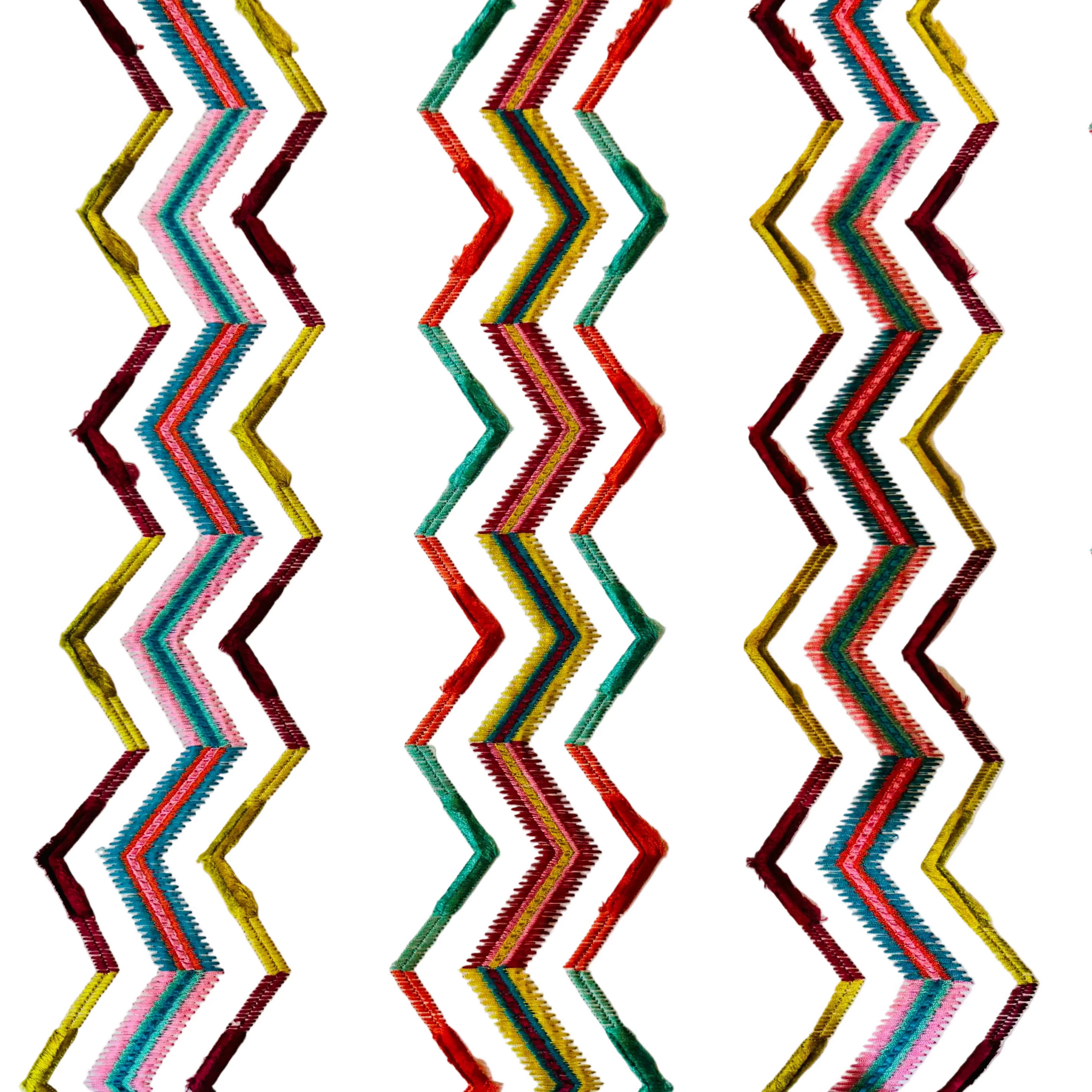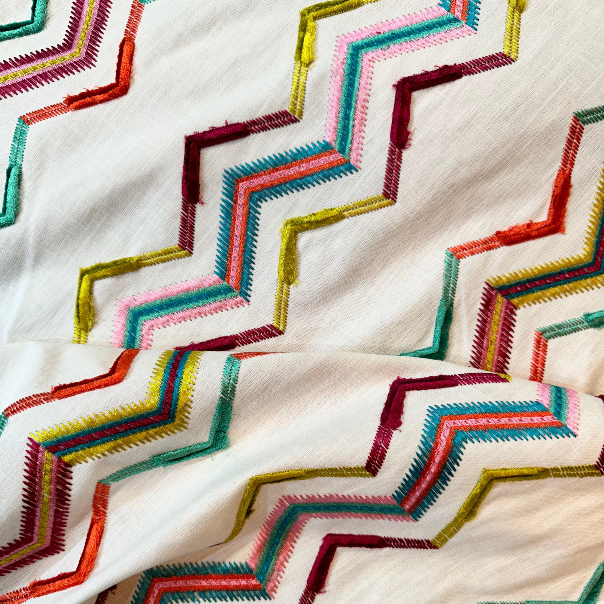 Swavelle Mill Creek Rapscallion Fiesta Decorator Fabric brings vibrant energy to any space with its large-scale multi-color chevron and stripe pattern. This festive embroidery on a crisp 100% cotton white base, creating visual interest and movement. Perfect for light upholstery, drapery, pillows, and home décor projects that demand personality and color.