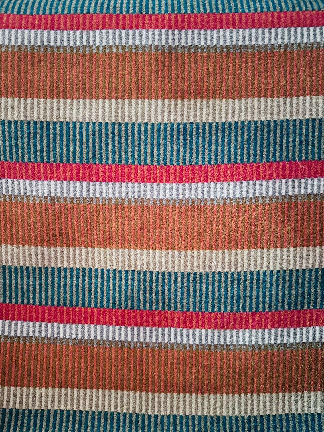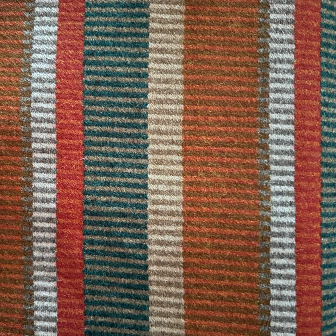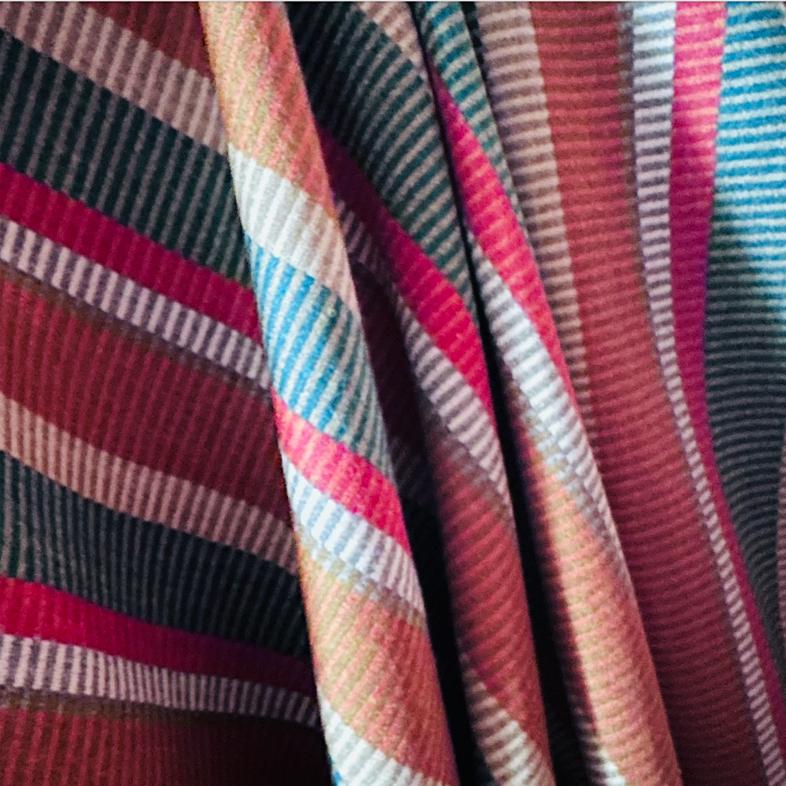 This wool blend fabric features a stunning multicolor stripe design, incorporating shades of teal, orange, coral, white, and grey. Luxurious and versatile, it adds a touch of elegance to any home decor or fashion project. Enjoy the warmth and durability of wool with a unique and eye-catching pattern.