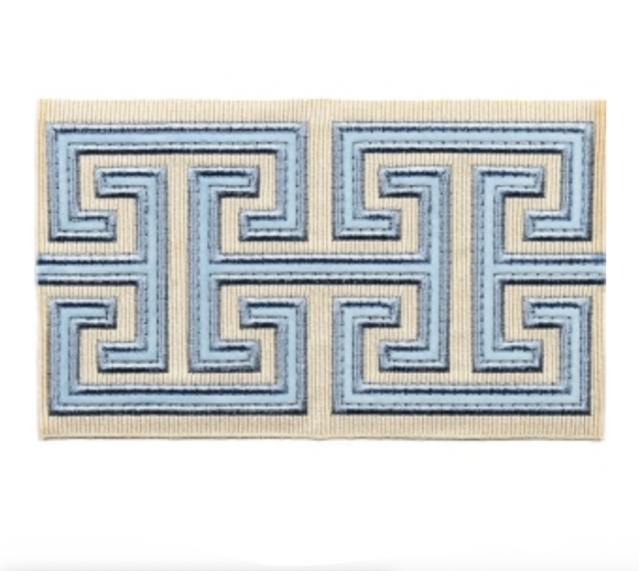 This is a fabulous blue key tape trim you can use for any home dec project. In delft blue embroidered thread on a white ground, you will love this trim to compliment your project. It is also perfect for creating extraordinary pillows and adding a lovely accent to any bedding.