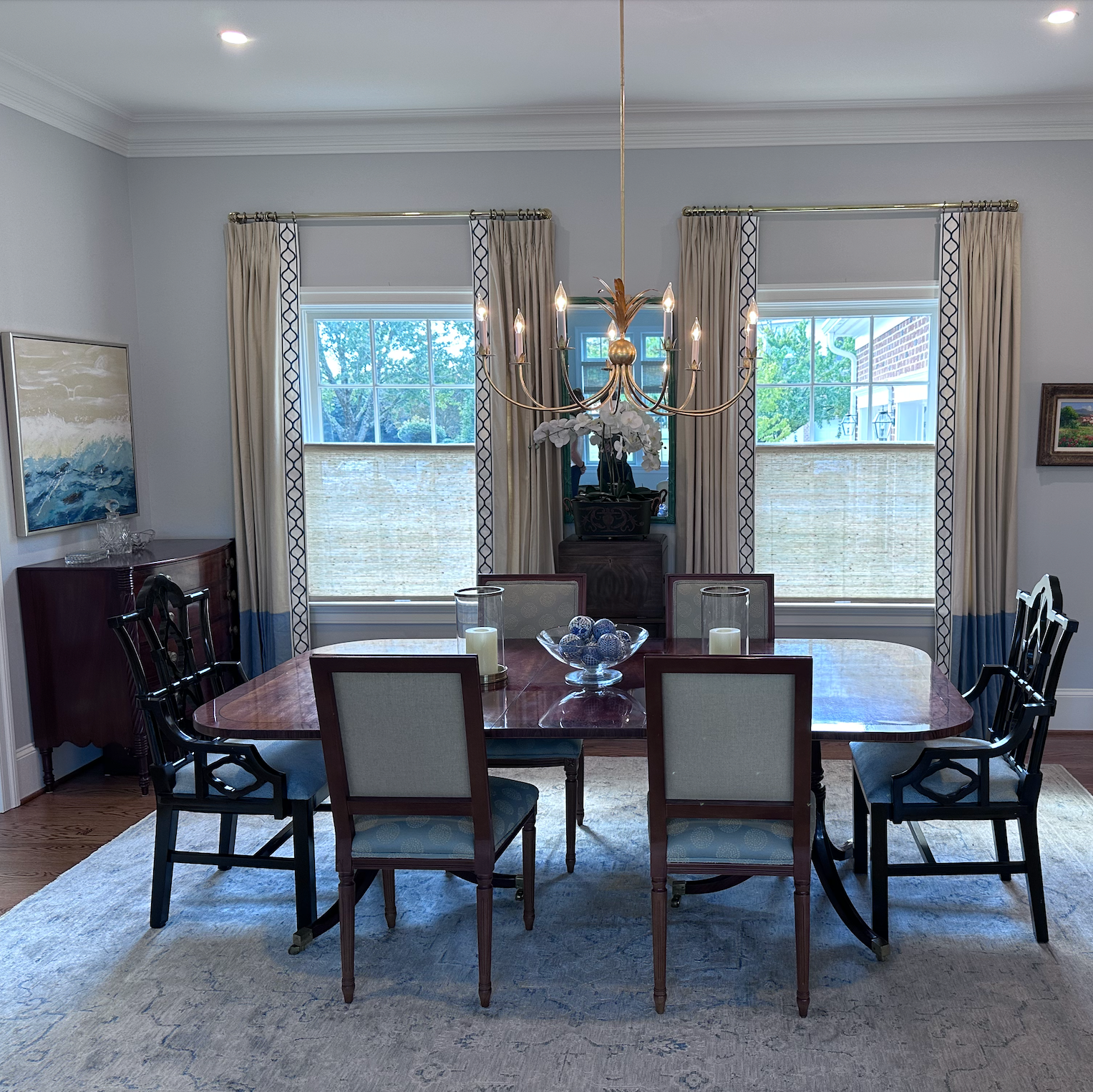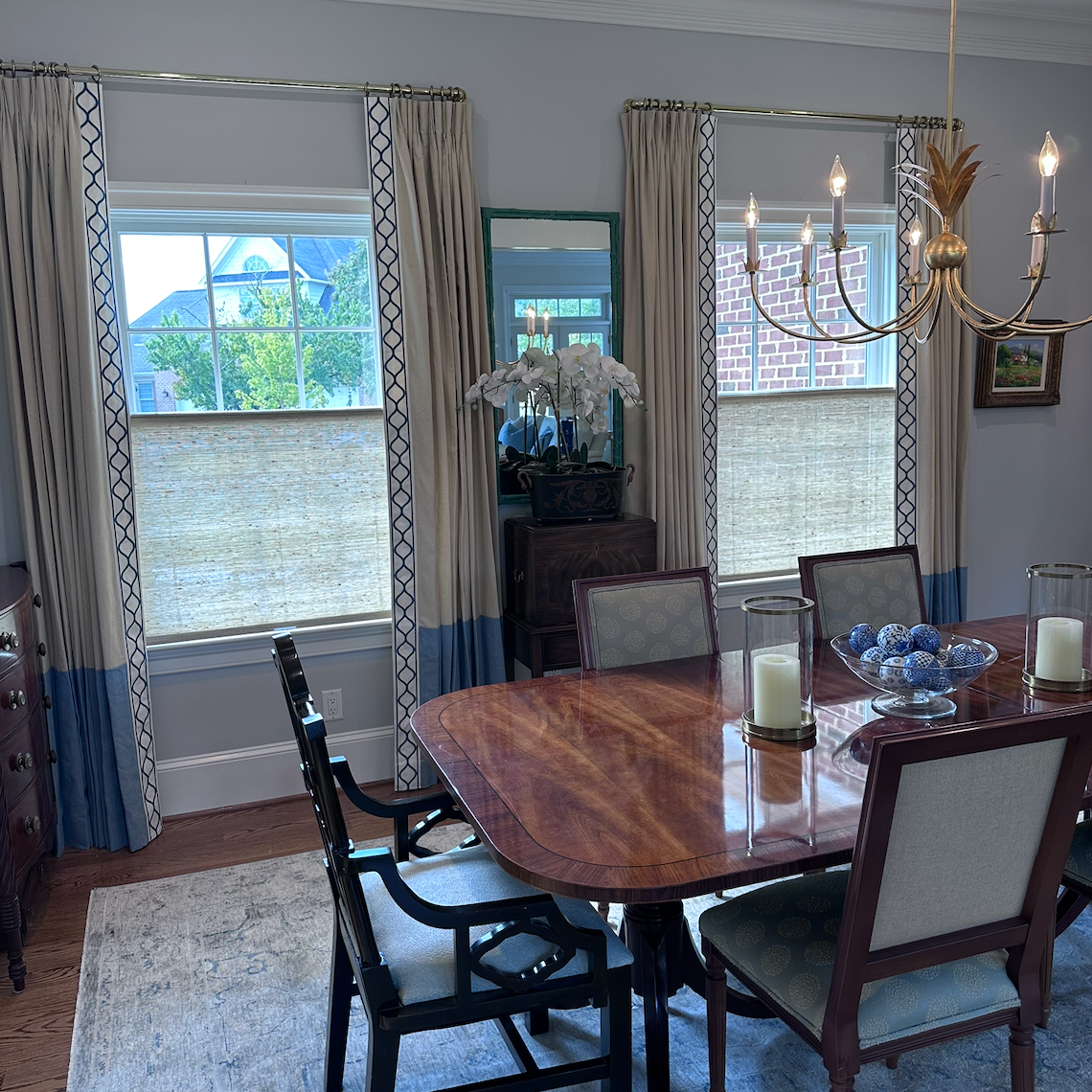 This Anbu Tape 4 decorative trim features a framed dotted ogee lattice design, embroidered in sky and navy blue threads on a crisp white canvas ground. Measuring 4 inches wide, it combines classic elegance with vibrant color contrast, ideal for adding refined detail and texture to textiles and home decor projects.