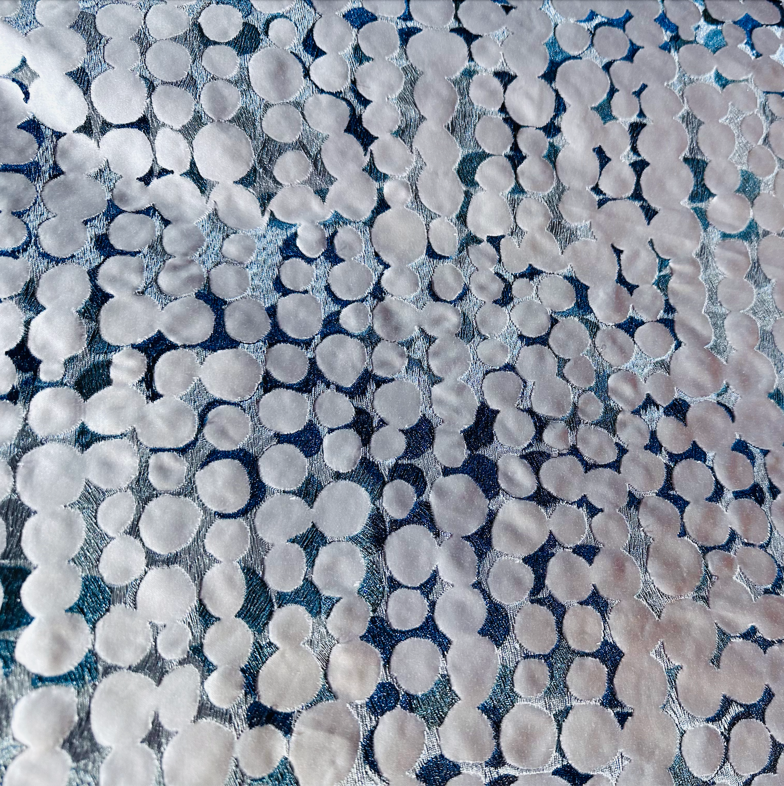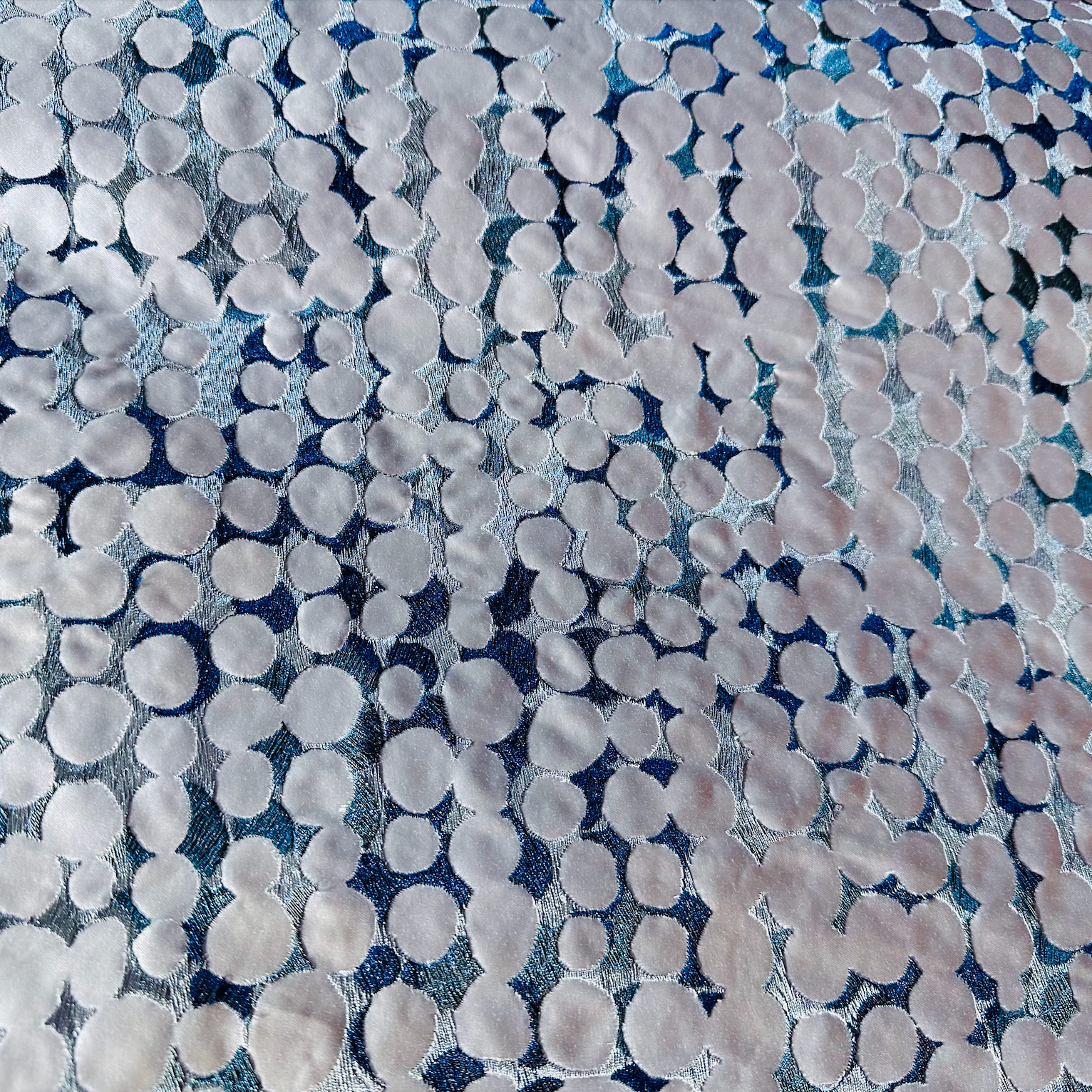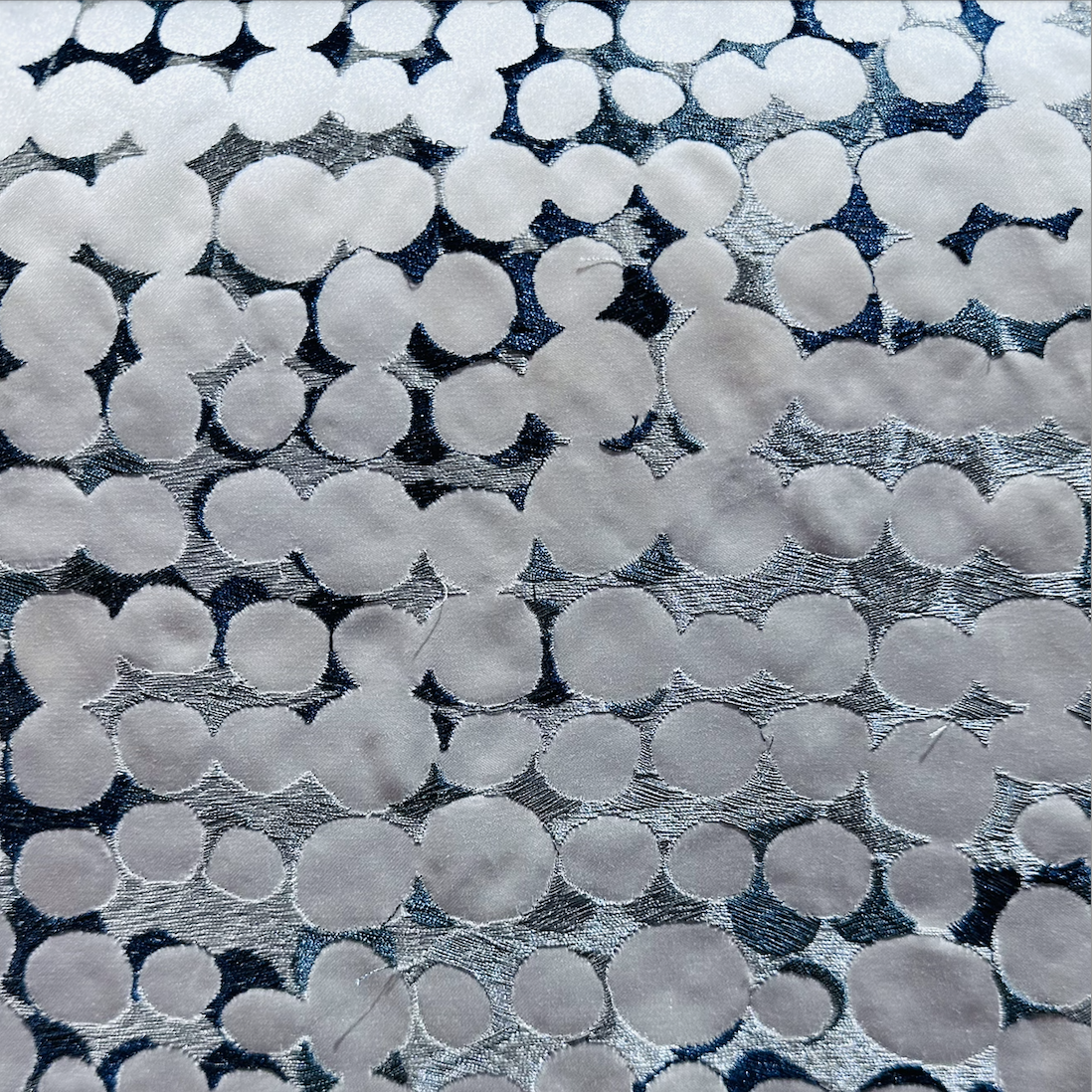 King Textiles Dimension Stone Decorator Fabric is a medium weighted embroidery on a smooth satin basecloth. Metallic silver and grey threads that shimmer blue when the light hits them are intricately stitched to form a sophisticated dotted circle pattern, adding depth and texture. Ideal for modern upscale drapery or widow treatment projects, upholstery pieces, and even decorative accents. This fabulous fabric combines visual complexity with a refined tactile experience for any area in your home or office.