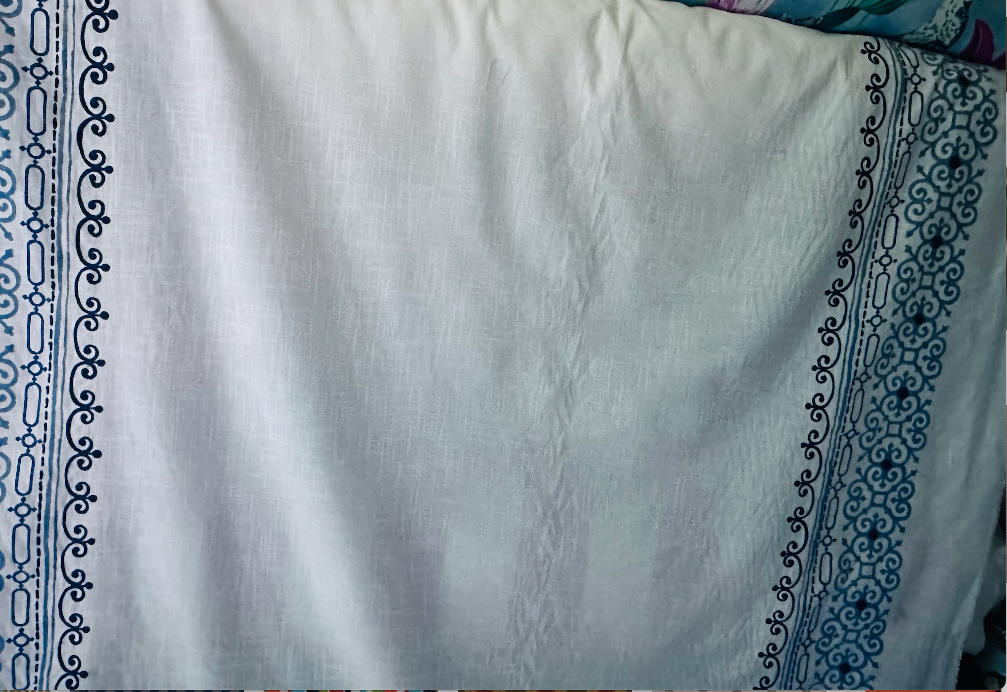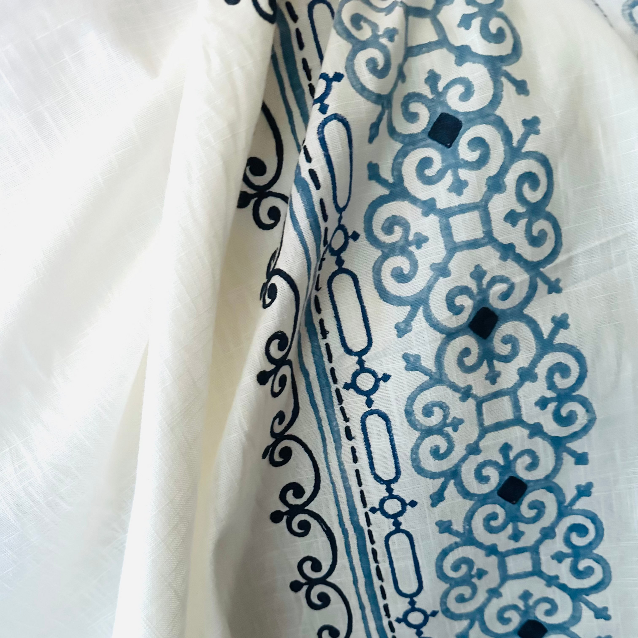 This crisp white linen blend fabric features printed vertical bands enhanced with embroidered accents in shades of blue, creating a refined bohemian-like aesthetic. Ideal for drapery panels, valances, cornice boards, bedskirts, and pillows, it offers a distinctive border pattern that elevates any home décor project with subtle texture and color contrast. Its versatile design allows for creative applications, making it a sophisticated choice for expert decorators seeking both style and functionality.