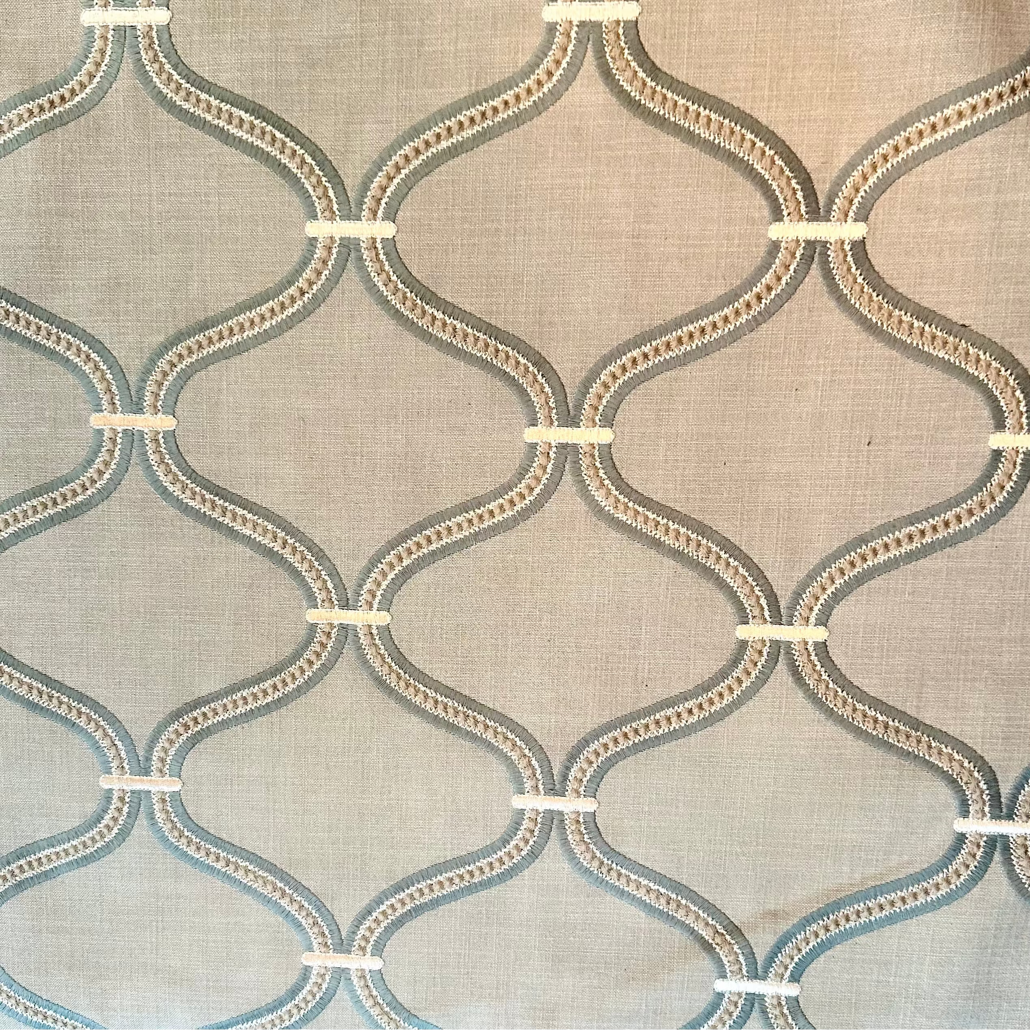 Elegant embroidered decorator fabric featuring a sophisticated ogee and trellis pattern in pale yellow and spa tones. The delicate embroidery is rendered on a natural flaxen linen-like base, creating a refined texture perfect for upholstery, drapery, or accent pieces. This first quality fabric from Swavelle Mill Creek combines classic design with contemporary color sensibility.