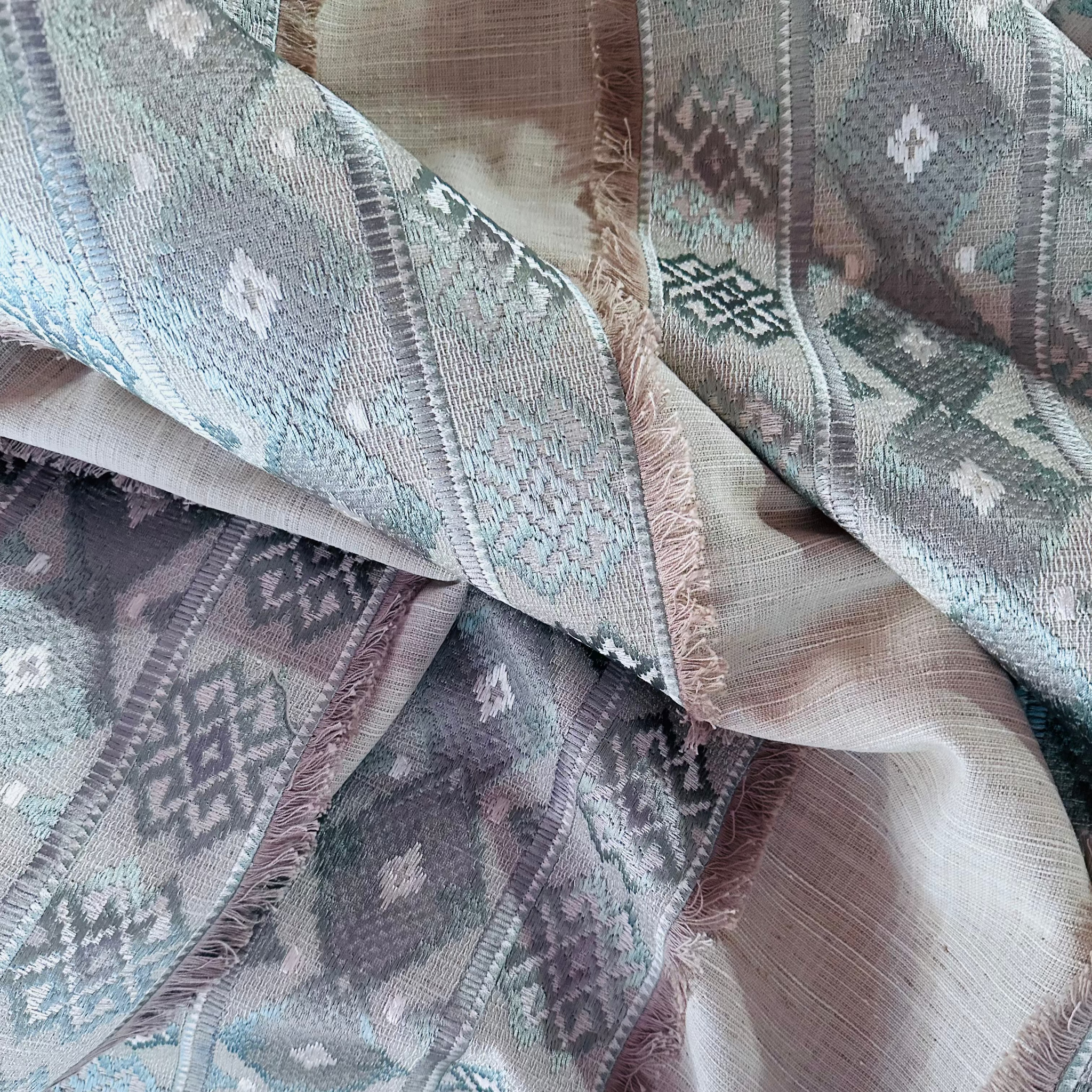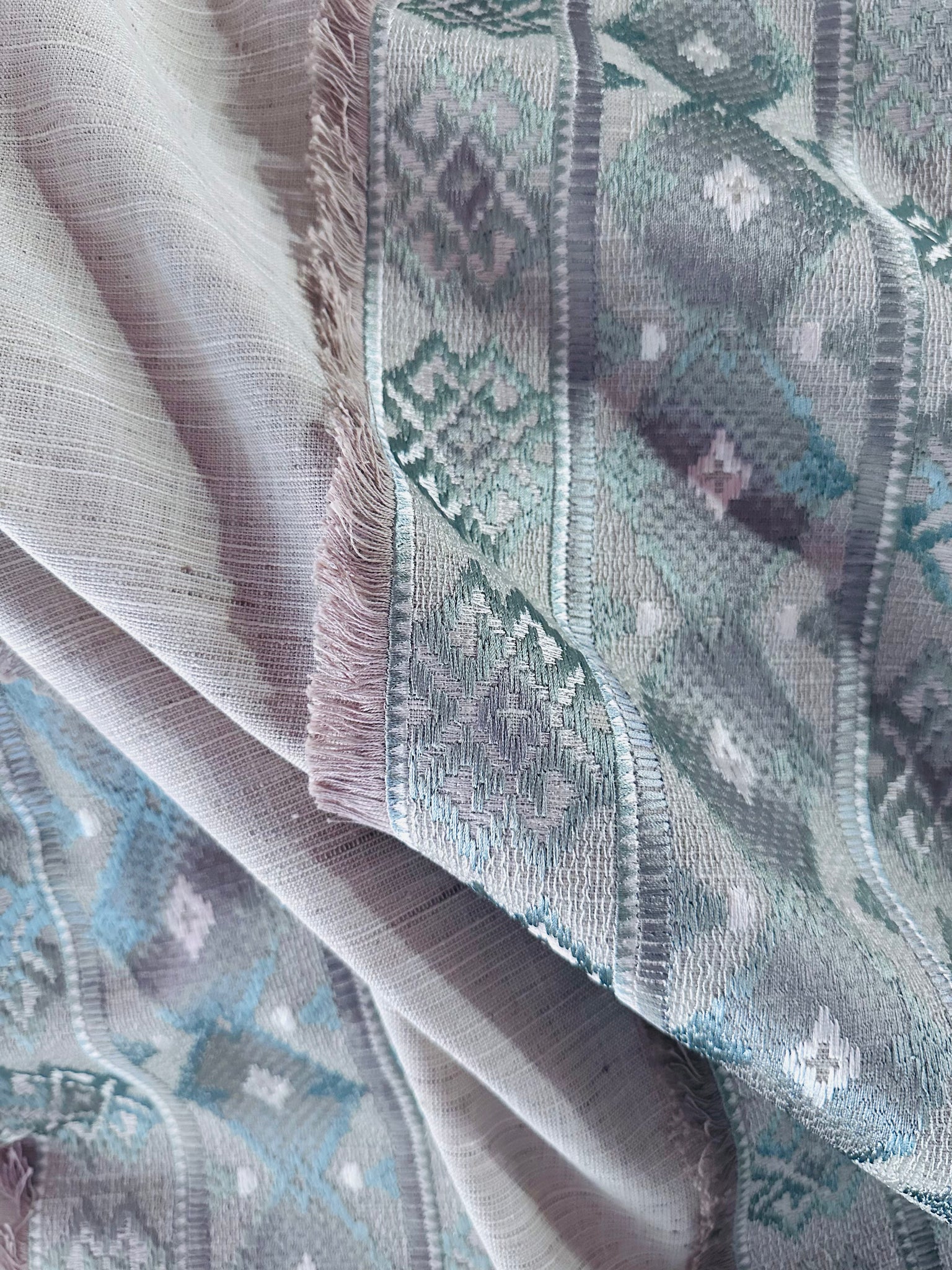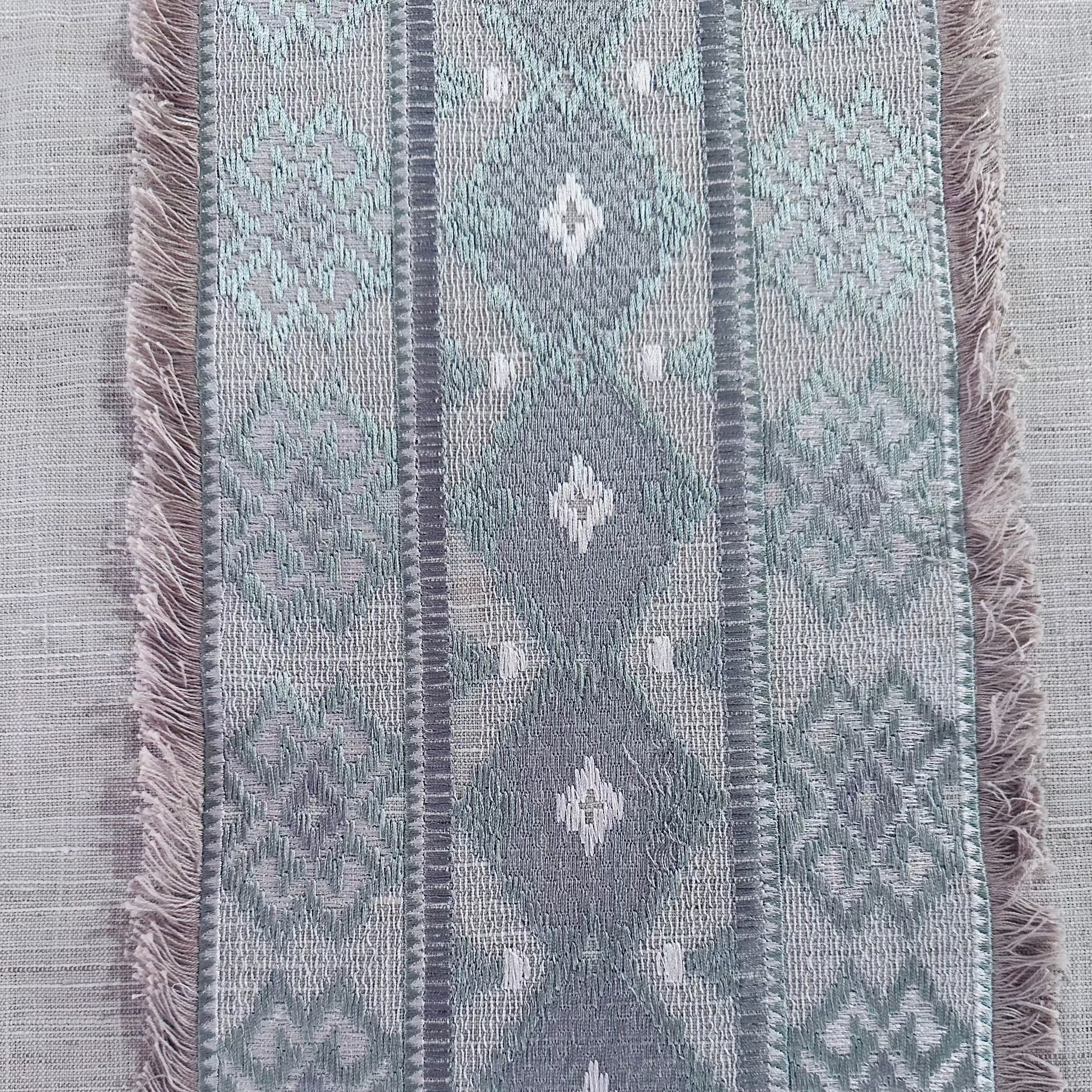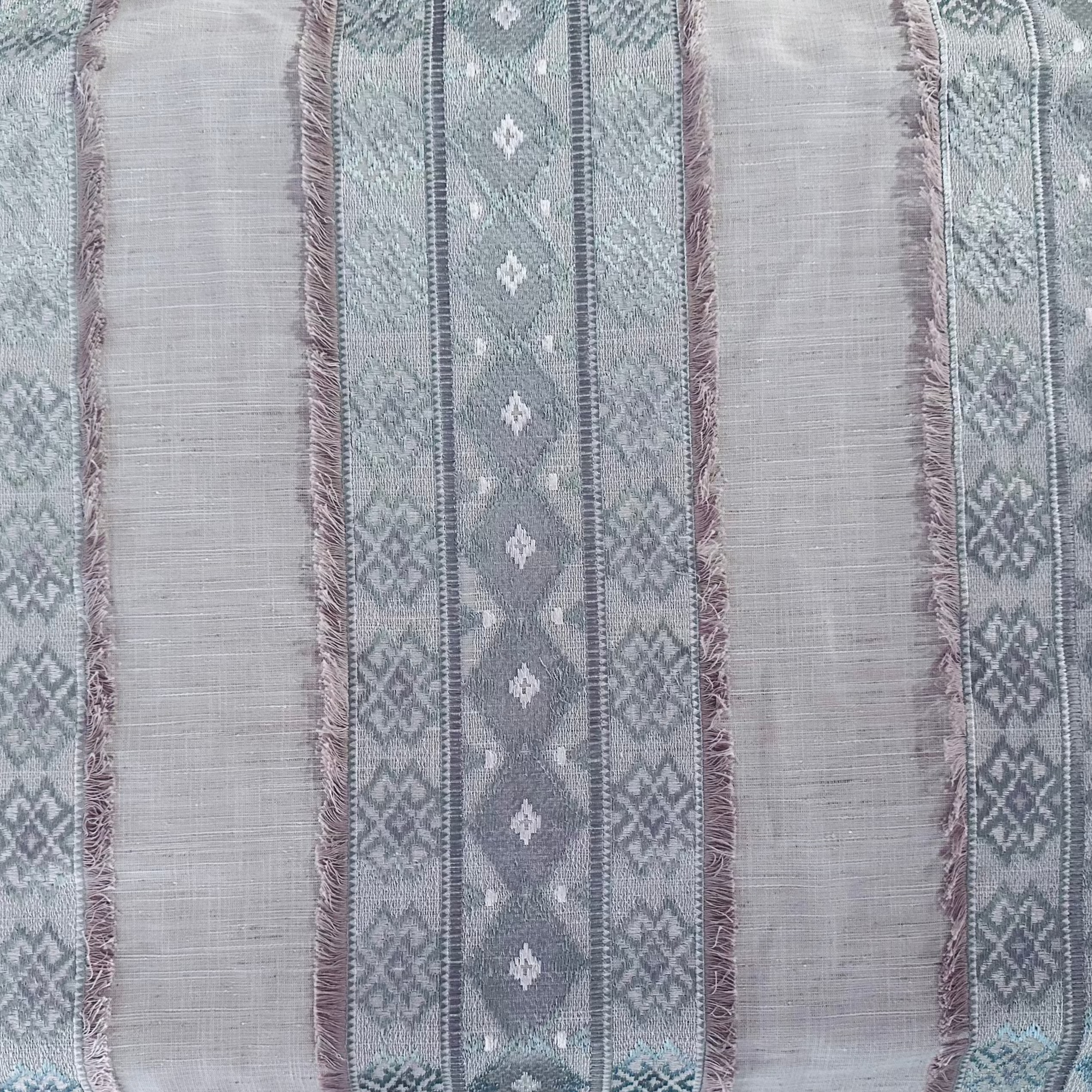 Swavelle Mill Creek Rustic Refined Spa Decorator Fabric features an expertly embroidered wide stripe framed in an eyelash fringe. Its spa and white tones are set against a textured, linen-like and linen colored ground. This geometric tribal diamond pattern adds a sophisticated, earthy touch, perfect for creating refined, rustic decor accents that blend durability with style. Ideal for upholstery, drapery, or decorative projects seeking a subtle yet distinctive artisan look.