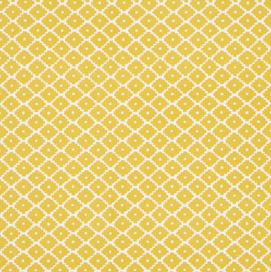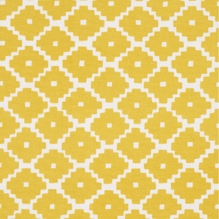 Schumacher's Ziggurat fabric showcases a small-scale diamond and dot lattice pattern in yellow and white, hand-printed on 100% cotton. Its refined design and natural fiber make it an excellent choice for coordinating with a variety of decor styles, offering both versatility and expert craftsmanship for your decorating needs.