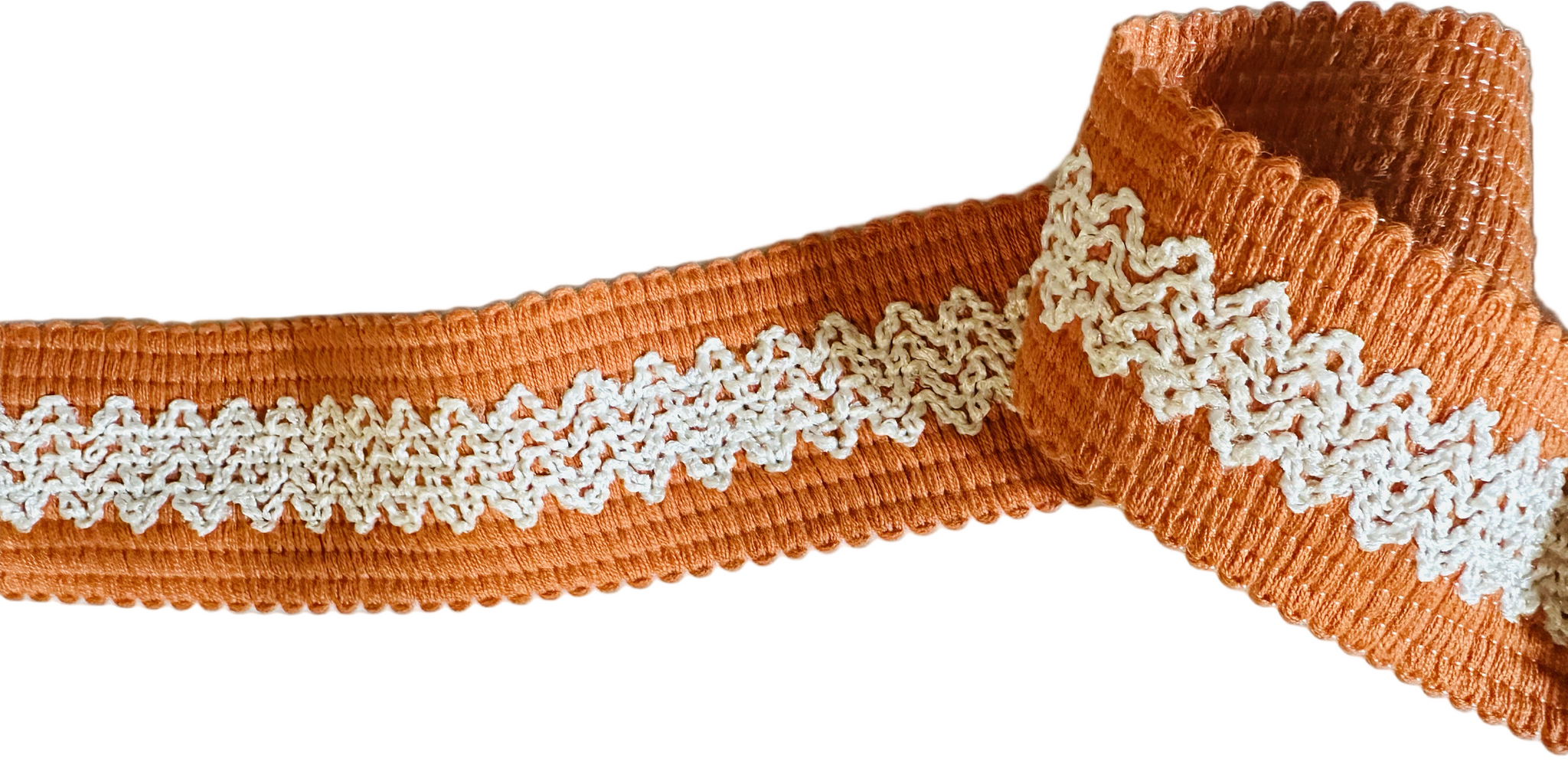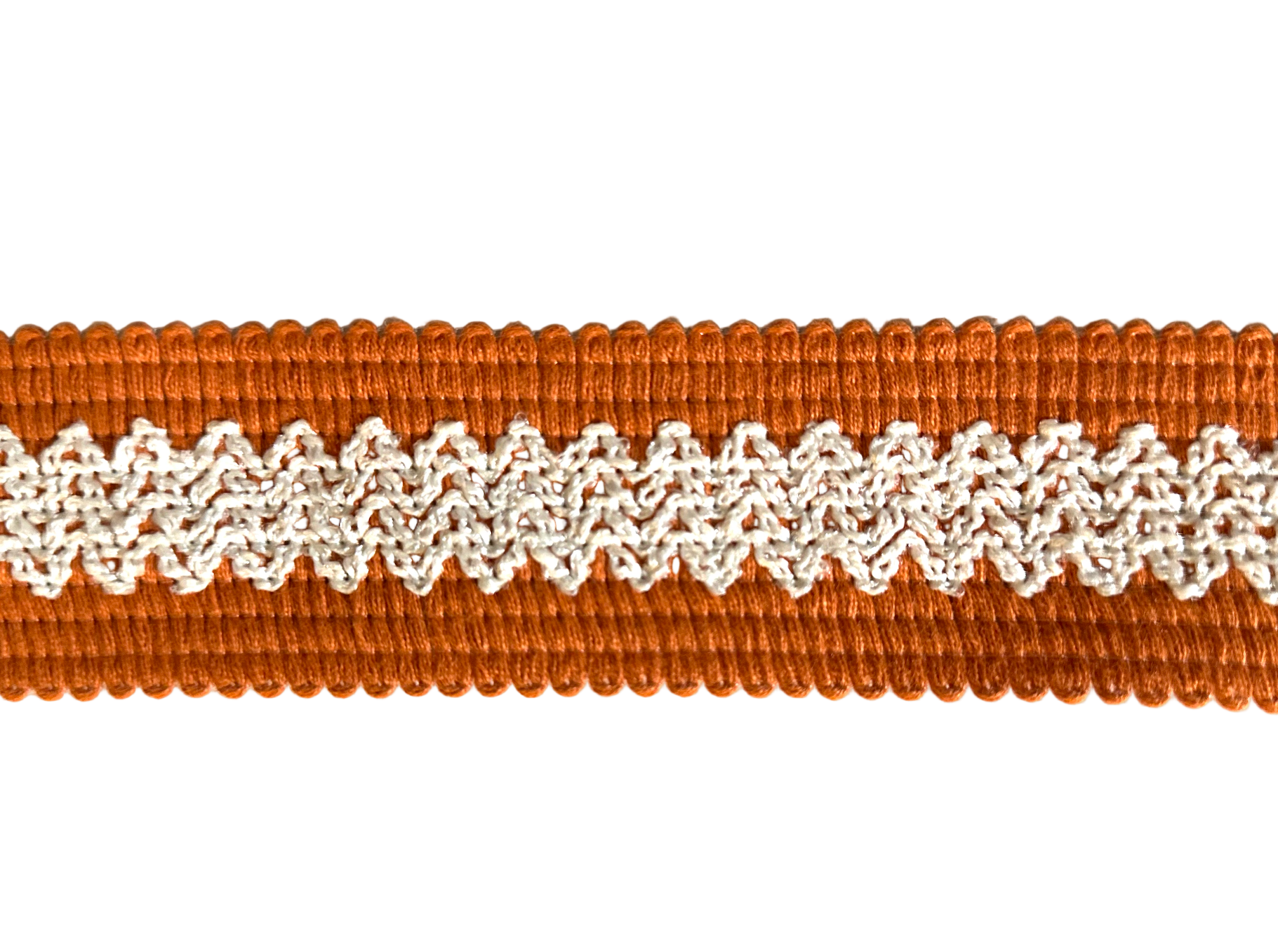 This refined decorative trim tape showcases a salmon foundation with an embroidered cream chevron pattern rendered in textured boucle yarn. The centered, raised design creates dimensional visual depth. At 2 inches wide, it provides substantial presence for upholstery edging, furniture detailing, and home furnishing applications. The sophisticated color palette and tactile surface quality make it an excellent choice for designers seeking premium finishing element to enhance any interior.