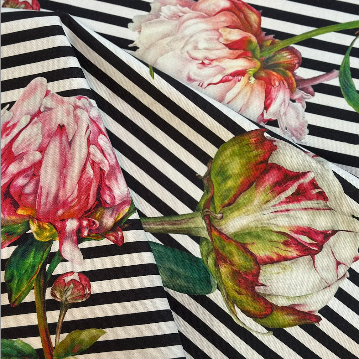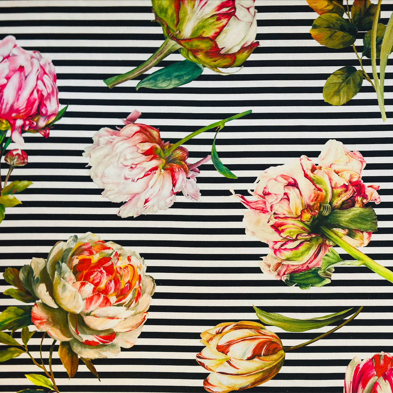 This printed fabric showcases a striking large-scale floral design rendered in vivid hues against a crisp horizontal black and white striped foundation. The bold botanical motif brings energy and sophistication to any interior project, while the contrasting stripe background adds visual depth and contemporary appeal. Crafted from a durable cotton blend, this versatile fabric works beautifully for upholstery, drapery, pillows, or accent pieces. The delightful interplay between the vibrant florals and geometric stripes creates a design that commands attention while maintaining refined elegance. Perfect for designers and homeowners seeking statement-making textiles with lasting quality.