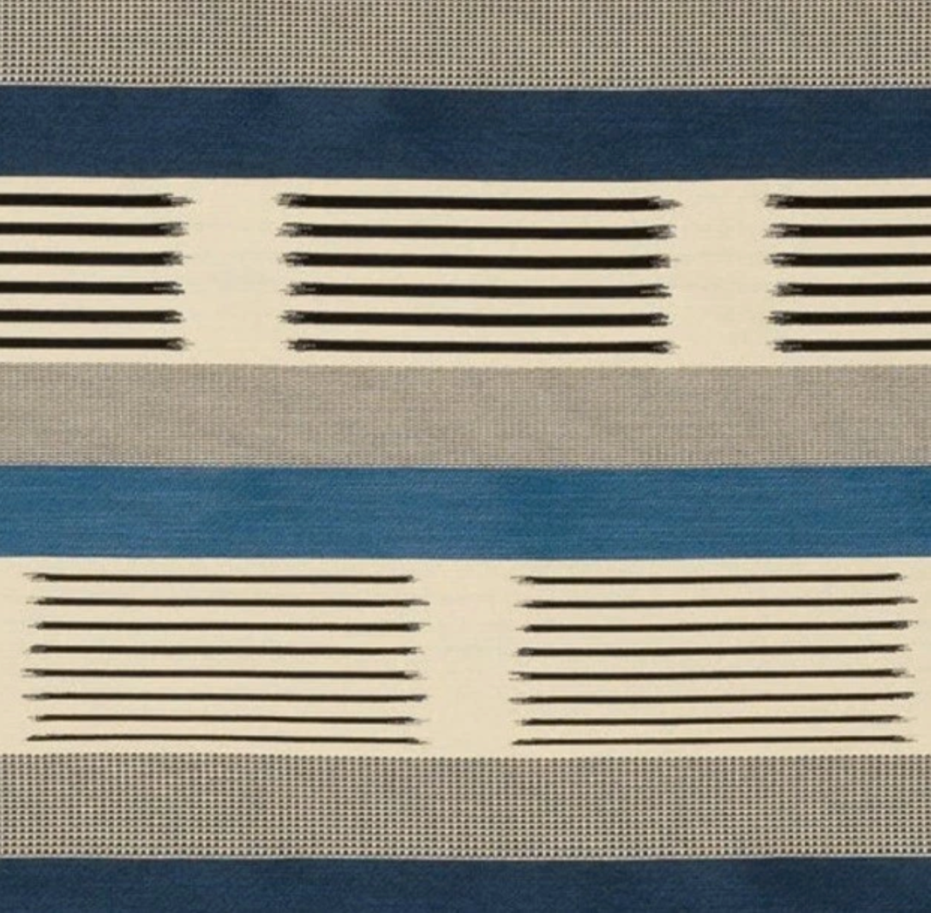 This 1.9 Yards Knoll Ikat Stripe Atlantic decorator fabric features a modern, contemporary design with horizontal dashes and stripes in sophisticated shades of blue, black, and white. Contract-rated for high durability and equipped with stain-repellent properties, it is ideal for demanding commercial and residential applications where performance meets style. Perfect for upholstery and accent pieces, it combines resilience with a fresh, elegant look.