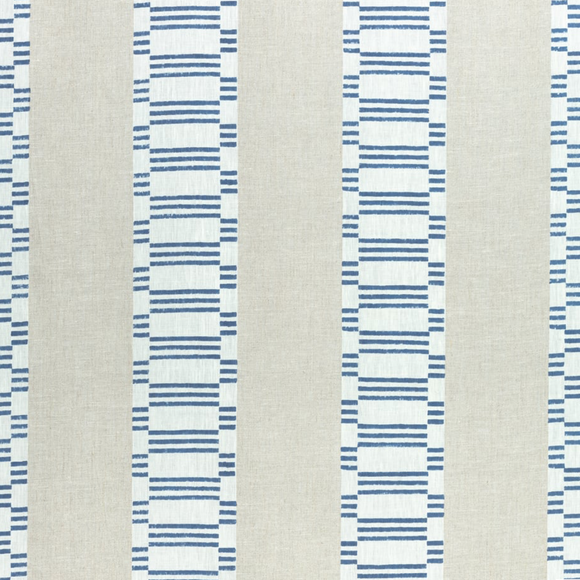 Expertly hand block printed, Thibaut's Japonica Stripe Navy Decorator Fabric features a classic stripe design in blue, white, and flax tones. Made from 100% linen, it adds a touch of elegance and sophistication to any decor. Perfect for drapery, upholstery, or accent pieces.
