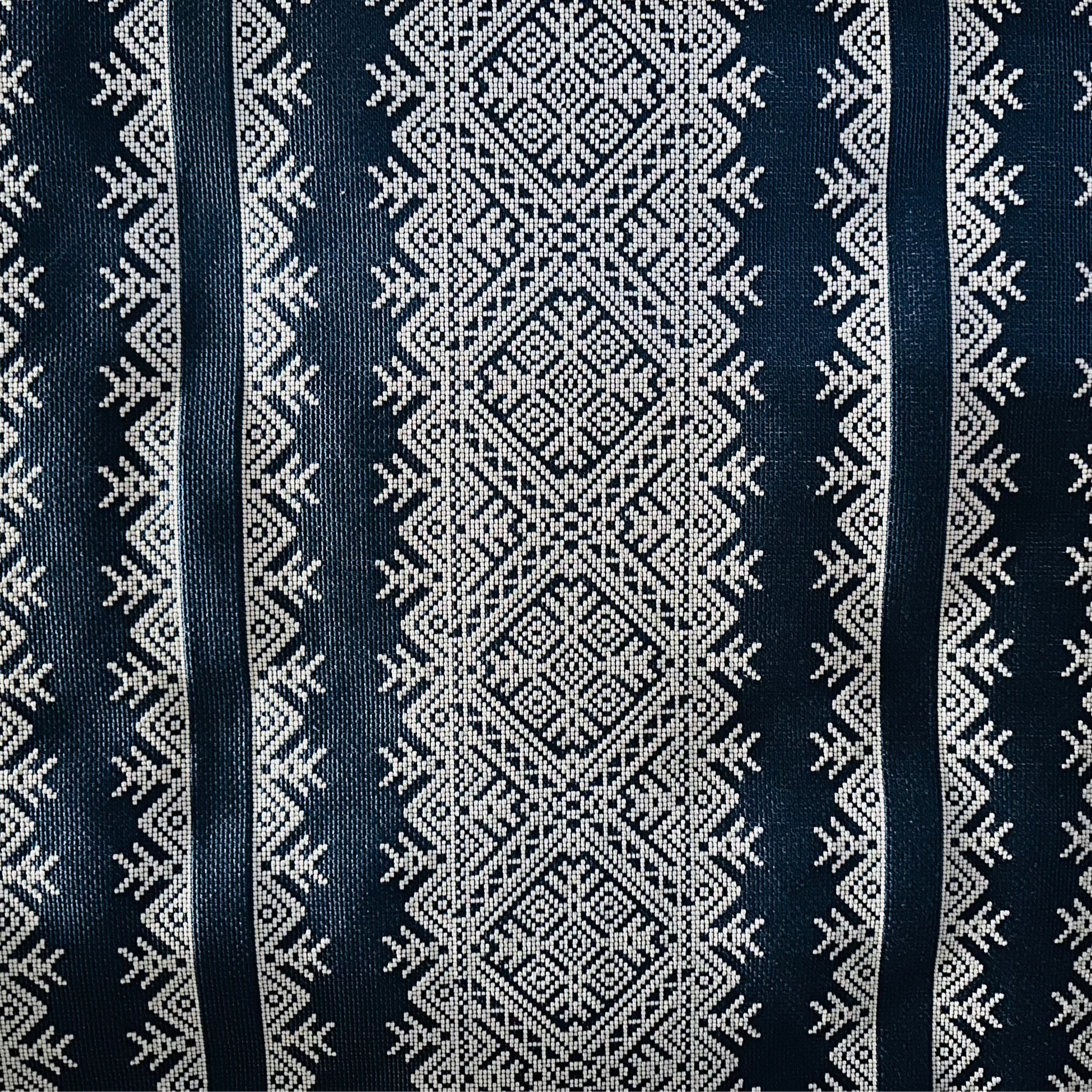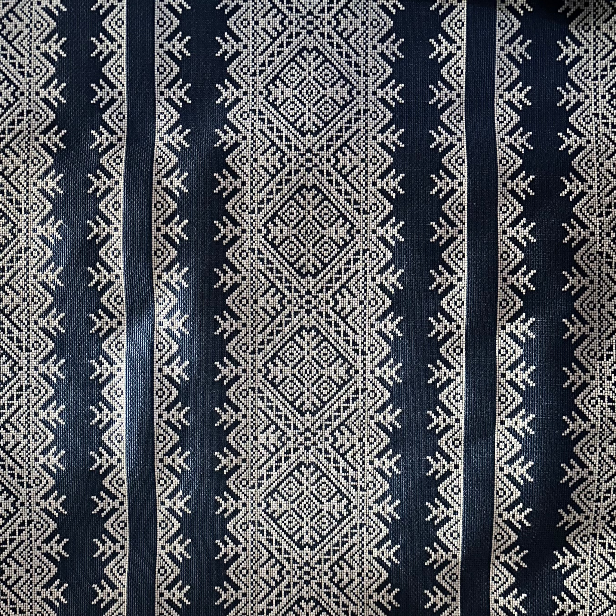 Introducing our Kogin Stripe Navy Decorator Fabric. With its geometric stripe design and repeating tribal diamond pattern, this woven fabric is perfect for adding a touch of sophistication to any space. The combination of blue and white creates a timeless color scheme that will elevate any decor